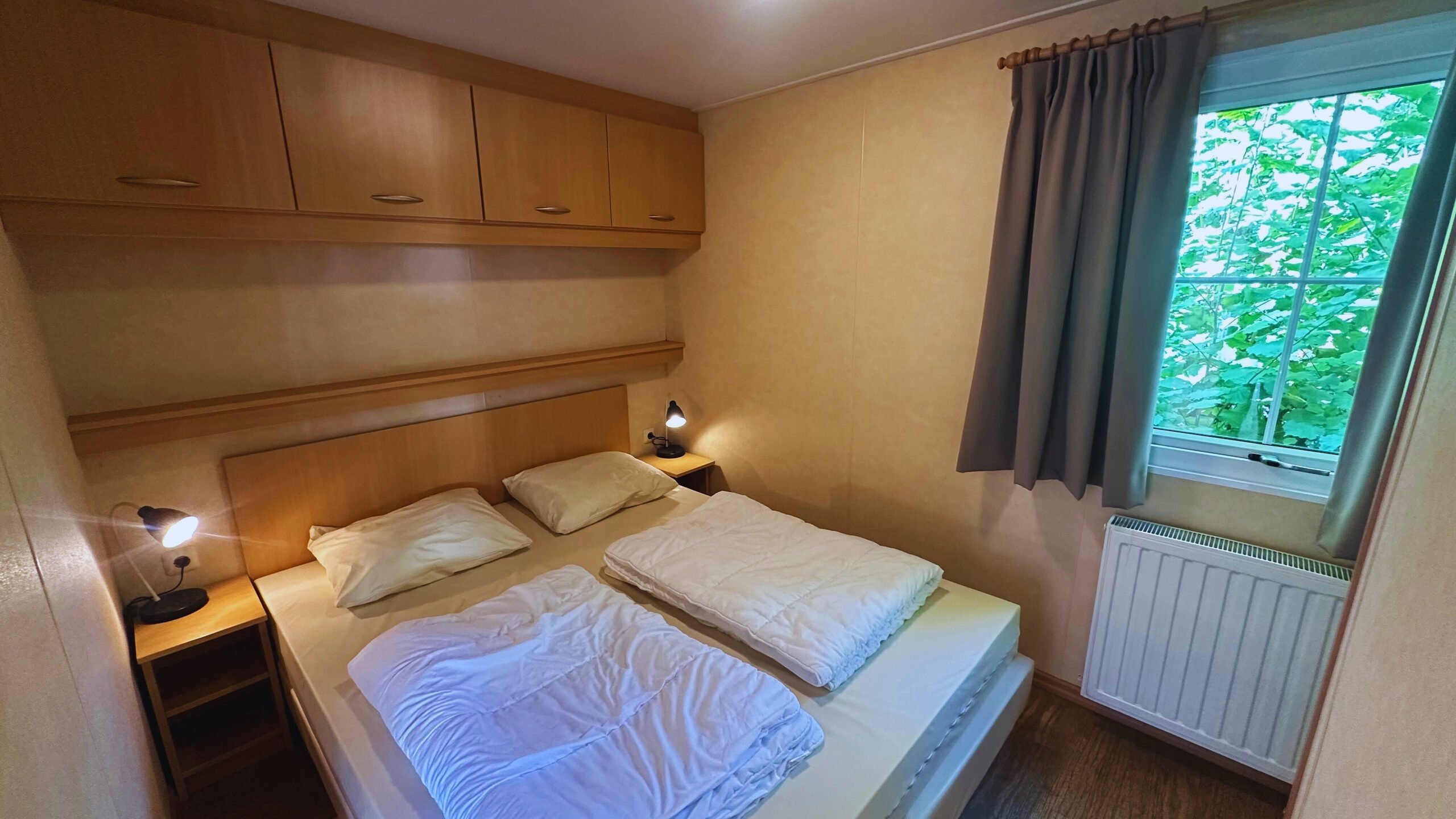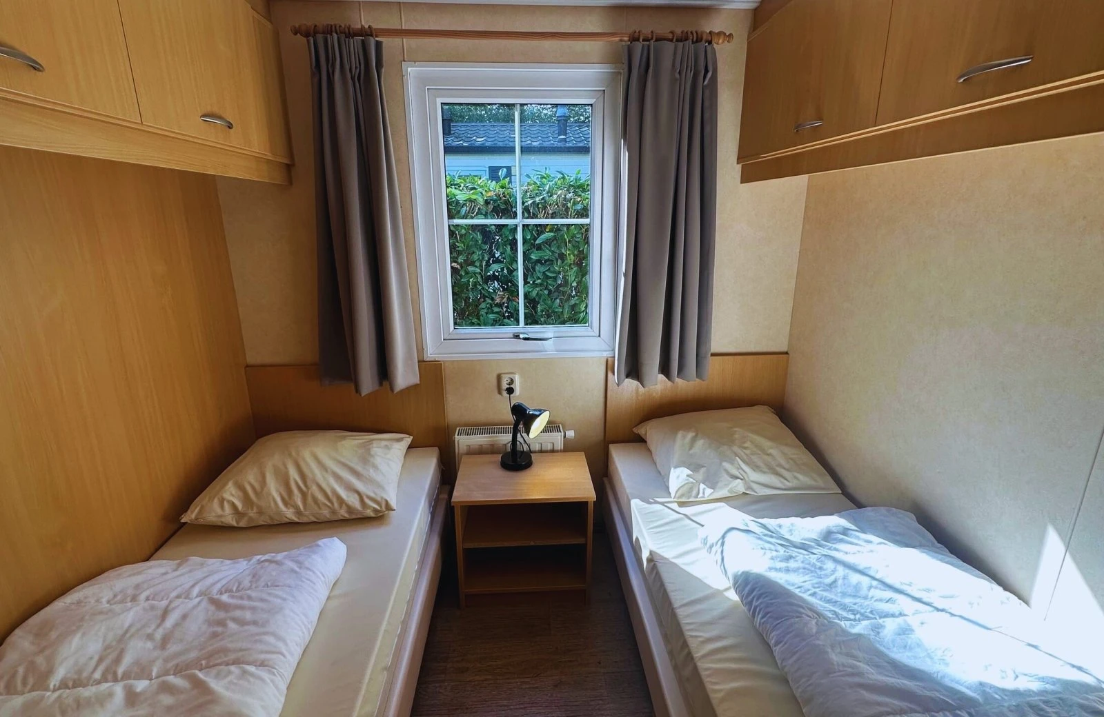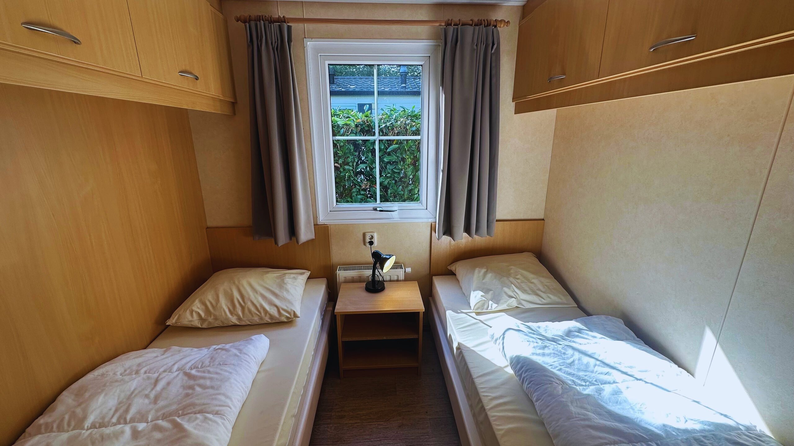 - 2 slaapkamers, waarvan 1 slaapkamer een tweepersoonsbed heeft en de andere 2 losse bedden