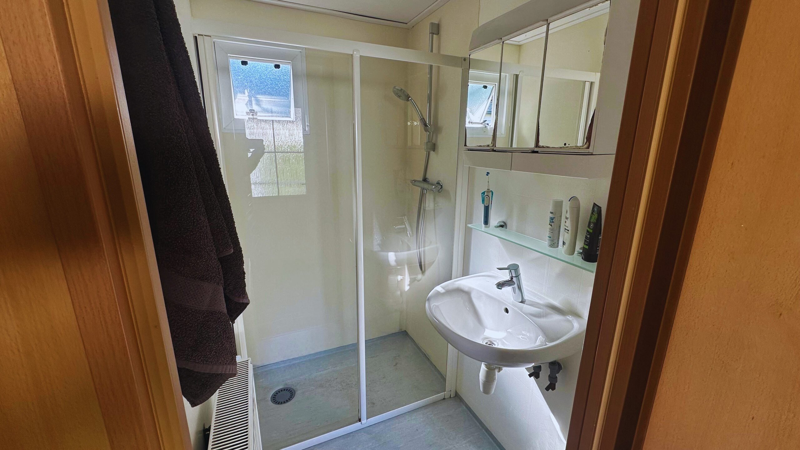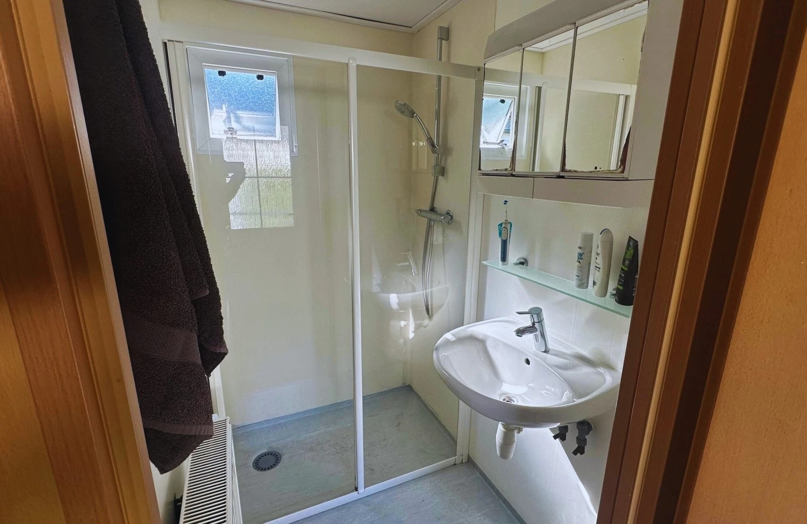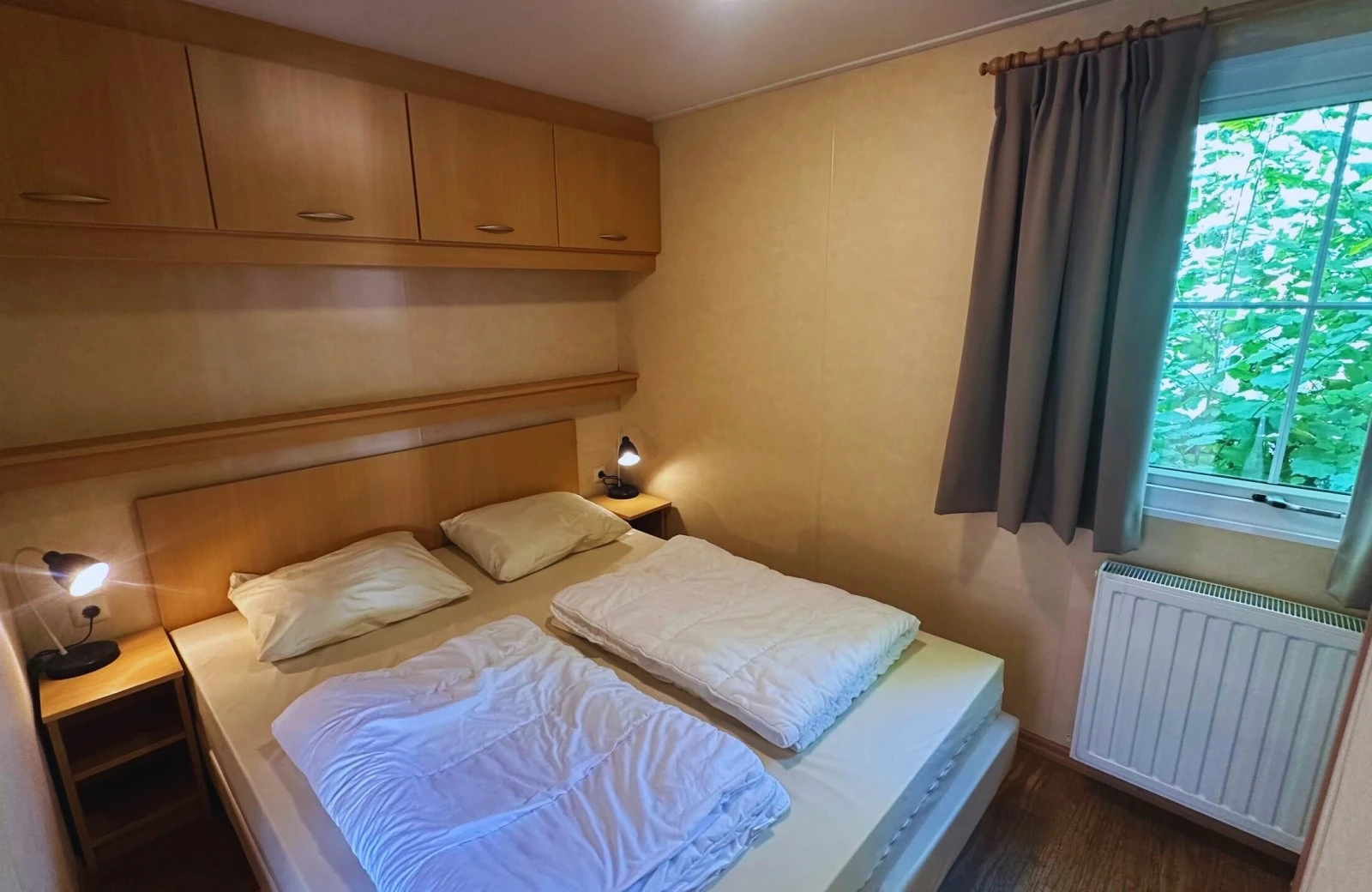 - 2 slaapkamers, waarvan 1 slaapkamer een tweepersoonsbed heeft en de andere 2 losse bedden
